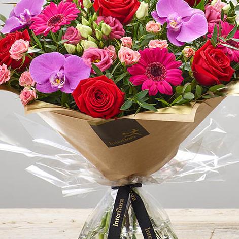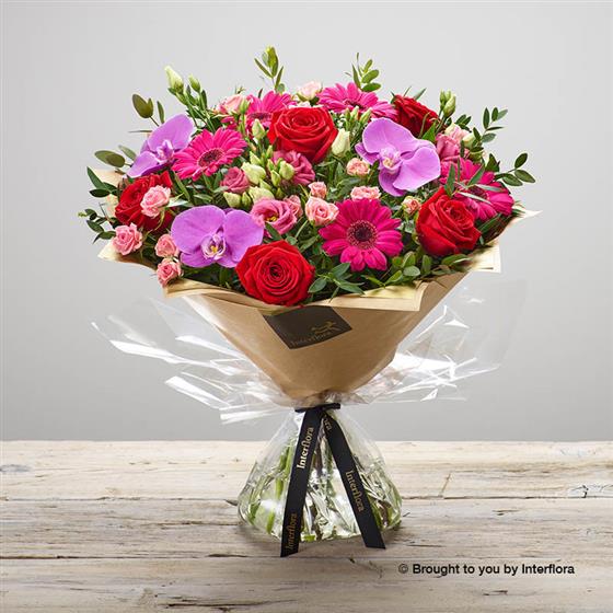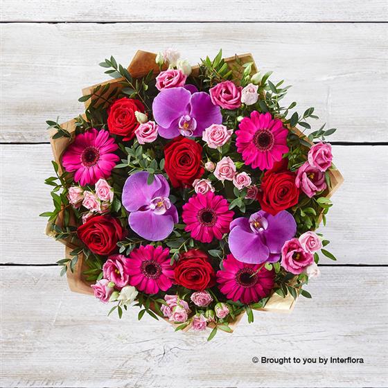 Featuring pink phalaenopsis orchids, red large headed roses, pink spray roses, pink lisianthus and cerise germini, hand-tied with eucalyptus and pistache, and presented in Interflora Gift Packaging.