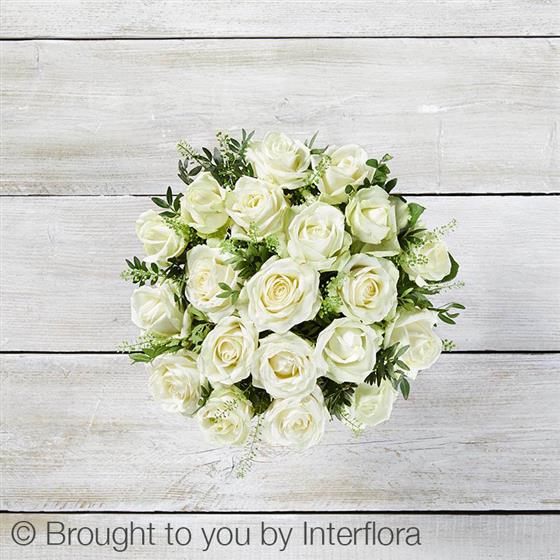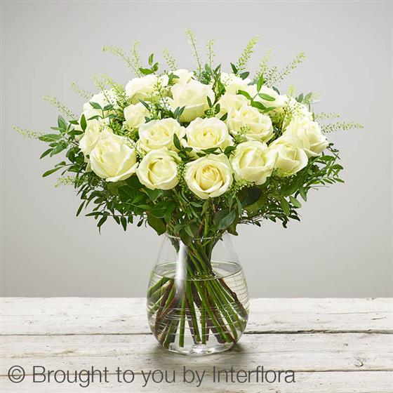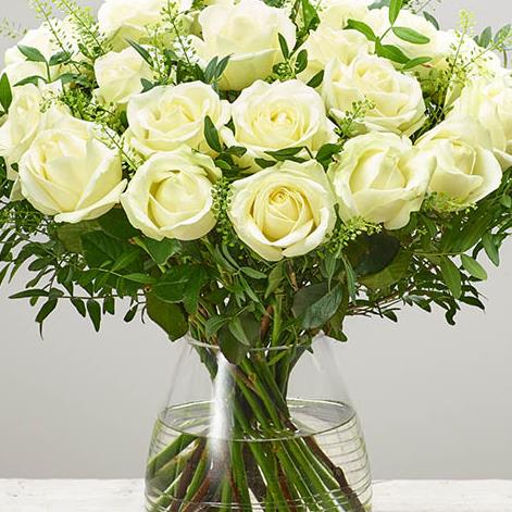 Featuring 20 large headed white roses hand-tied with thlaspi and pistache, presented in a clear swirl glass vase.