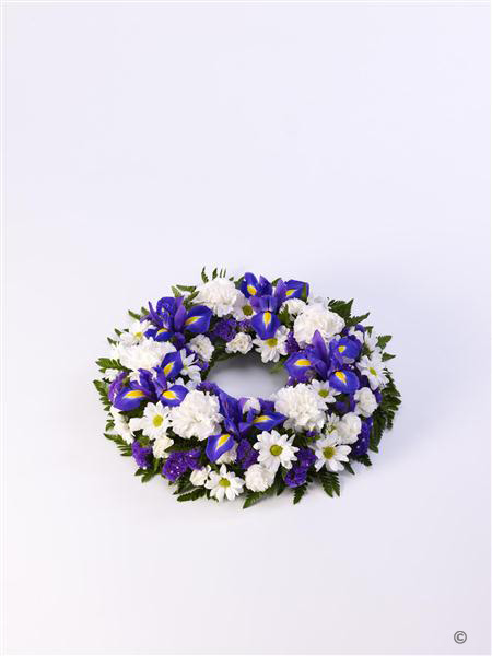 A classic selection of flowers including irises, carnations and spray chrysanthemums in blues and whites are nestled into this traditional circular wreath. Approximate diameter 50cm (19 inches).