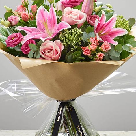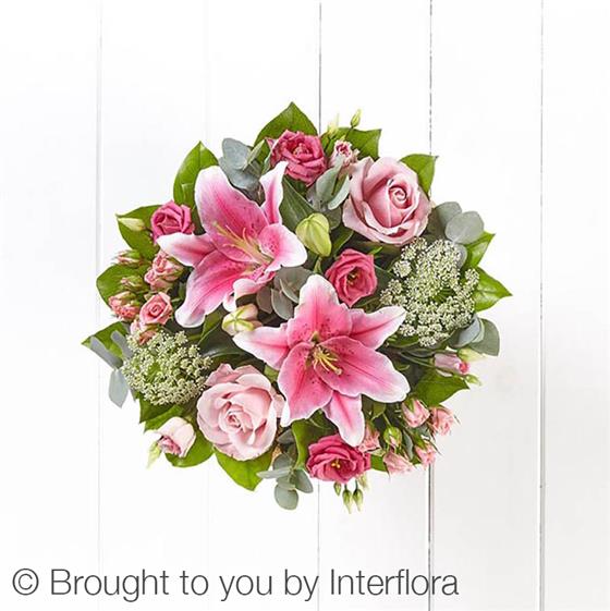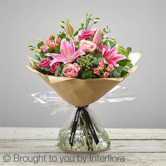 Featuring pink Oriental lilies, pink large-headed roses, pink spray roses, pink lisianthus and white ammi, hand-tied with eucalyptus and salal and presented in Interflora Gift Packaging.