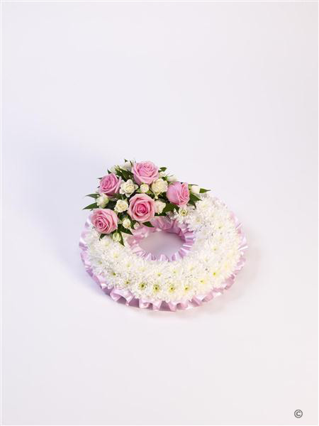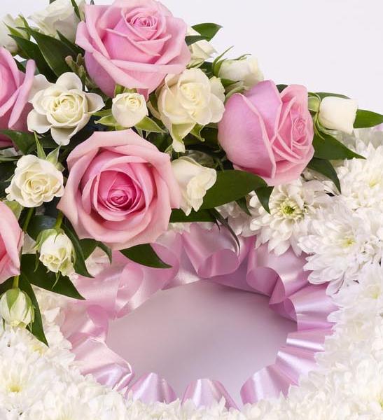 A classic circular wreath covered with a mass of white double spray chrysanthemums and finished with a pink and white spray of roses and spray roses and finished with a pink ribbon trim. Approximate diameter 44cm (17 inches).