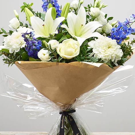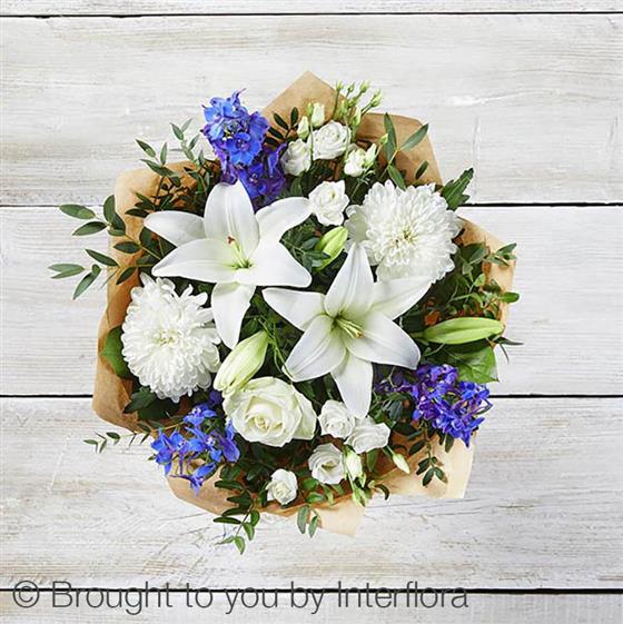 Featuring white LA lilies, white large headed roses, white chrysanthemum blooms, white lisianthus and blue delphinium, hand-tied with salal, pistache and eucalyptus, presented in Interflora Gift Packaging.