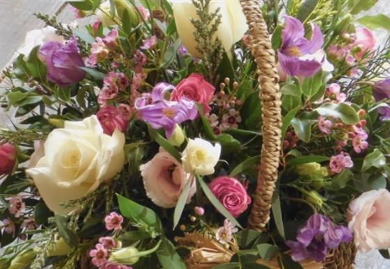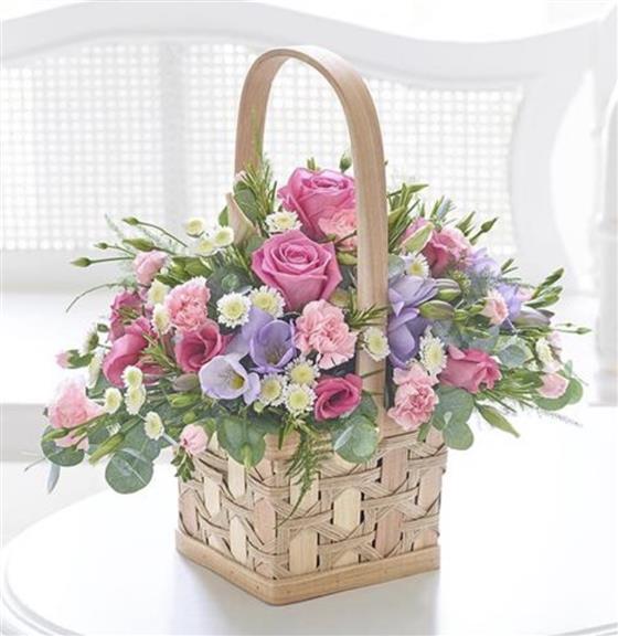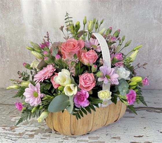A beautiful mixture of pastel flowers arranged within a complimenting basket, all you need to do is display and spray with water occasionally