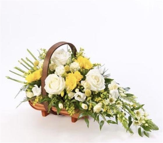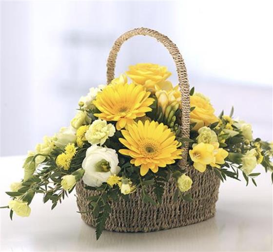 A beautiful mixture of yellow flowers arranged within a complimenting basket, all you need to do is display and spray with water occasionally