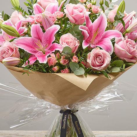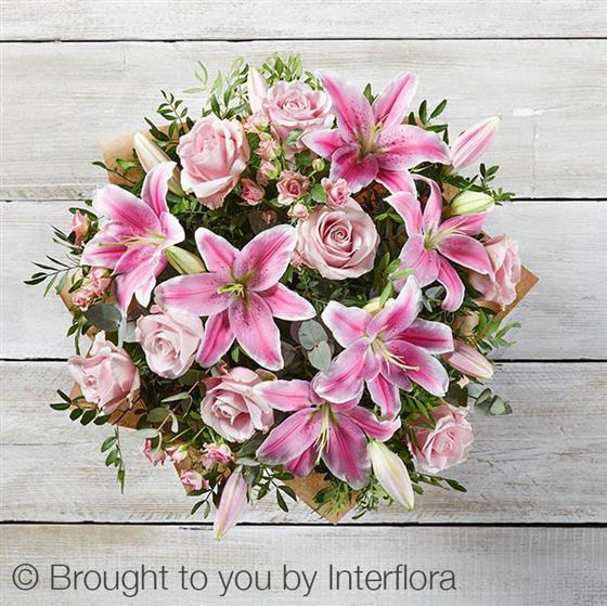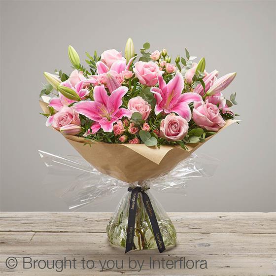 Featuring pink Oriental lilies, pink large headed roses and pink spray roses, hand-tied with eucalyptus and pistache, presented in Interflora Gift Packaging.