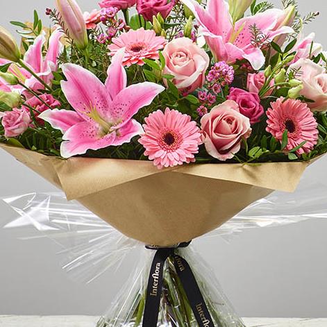 Featuring pink Oriental lilies, pink large-headed roses, pink spray roses, pink lisianthus and white ammi, hand-tied with eucalyptus and salal and presented in Interflora Gift Packaging.