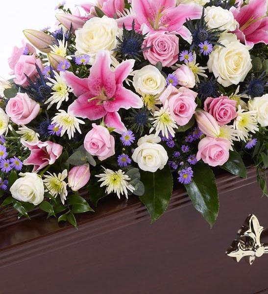 A selection of pink and white Rose are arranged with stunning pink Oriental Lily, blue eryngium, white spray chrysanthemums, lilac September flowers and a selection of foliage to create this beautiful casket spray. Approximate height 92cm (3ft).