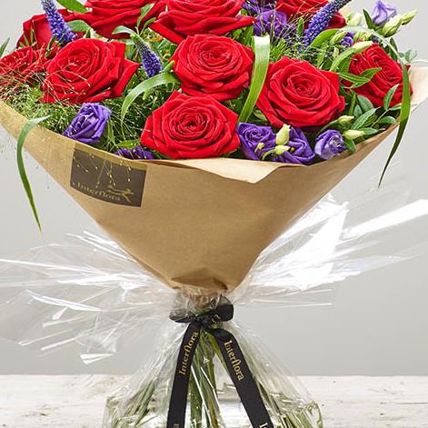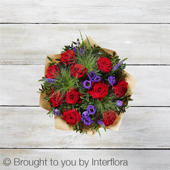 Featuring red large headed roses, purple lisianthus and purple veronica hand-tied with pistache and panicum grass, presented in Interflora Gift Packaging.