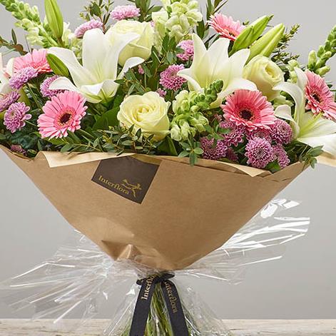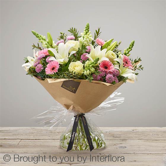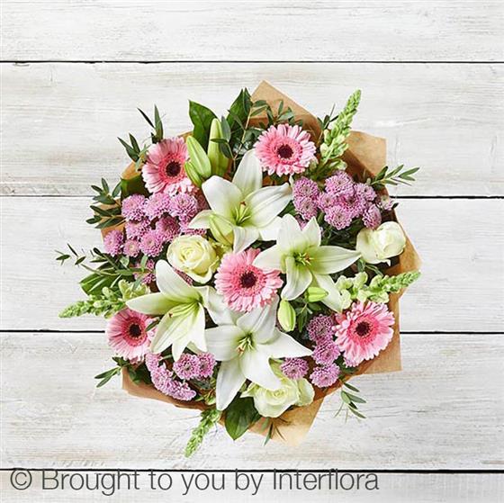Featuring white LA lilies, Ivory Large Headed Roses, pink spray chrysanthemums, white antirrhinums and pink germini, hand-tied with eucalyptus and salal, wrapped and presented in Interflora Gift Packaging.