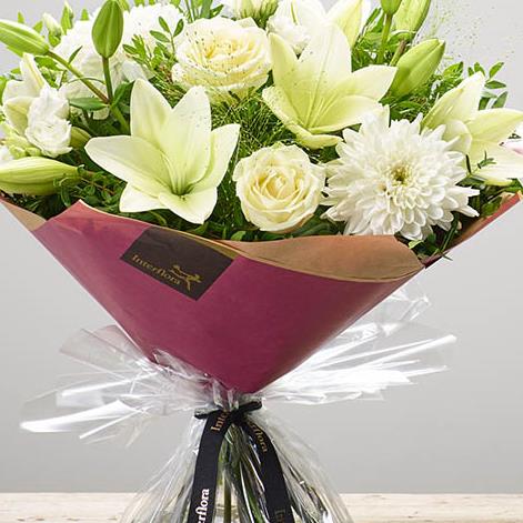Featuring white large headed roses, white LA lilies, white chrysanthemum blooms and white lisianthus with salal, pistache and panicum grass, hand-tied, wrapped and presented in Interflora gift packaging.