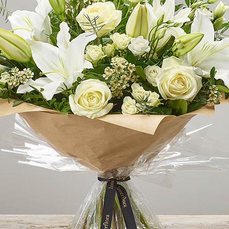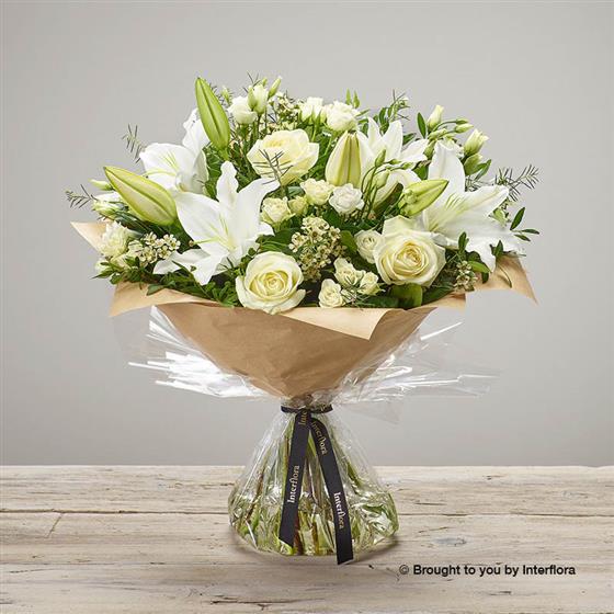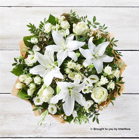 Featuring white germini, white Oriental lilies, white lisianthus, white large-headed roses and white ammi, hand-tied with eucalyptus and salal, presented in Interflora Gift Packaging.